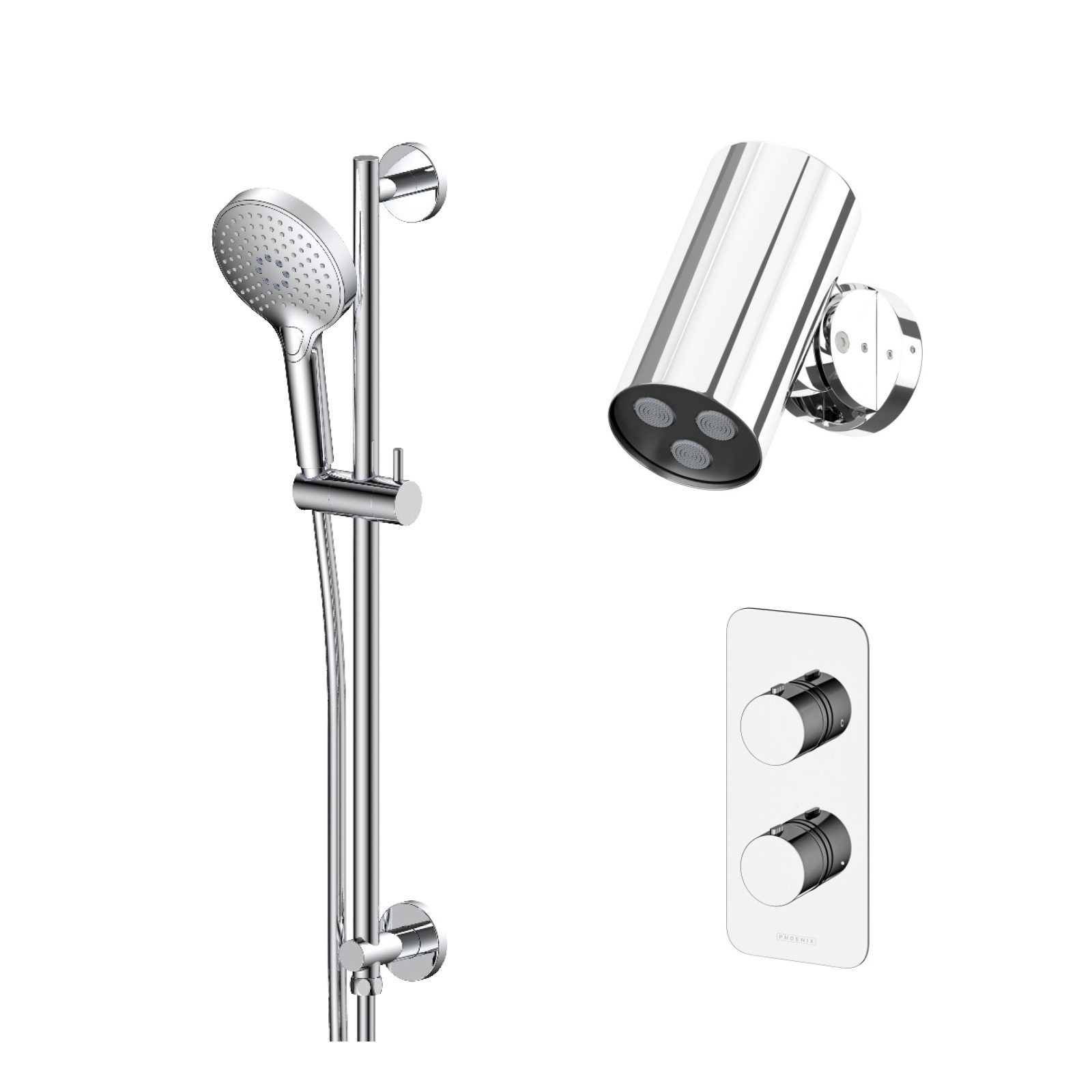 - Round Handset with Smooth Hose & Bracket or Luxury Slide Rail with Multi Function Handset, Smooth Hose & Built-in Outlet